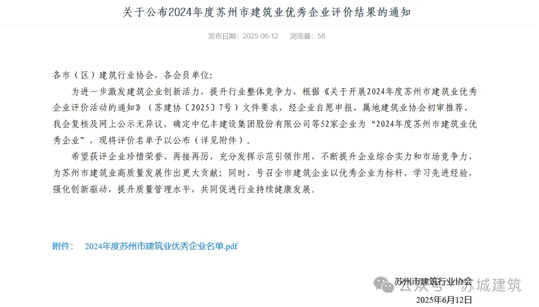 6月12日,蘇州市建筑行業(yè)協(xié)會正式公布2024年度蘇州市建筑業(yè)優(yōu)秀企業(yè)名單,蘇城建筑憑借卓越的綜合實力、優(yōu)質(zhì)的工程質(zhì)量和良好的行業(yè)口碑,再次榮耀登榜,連續(xù)多年獲評“優(yōu)秀企業(yè)”稱號,彰顯了企業(yè)在蘇州建筑行業(yè)的領先地位和品牌影響力。